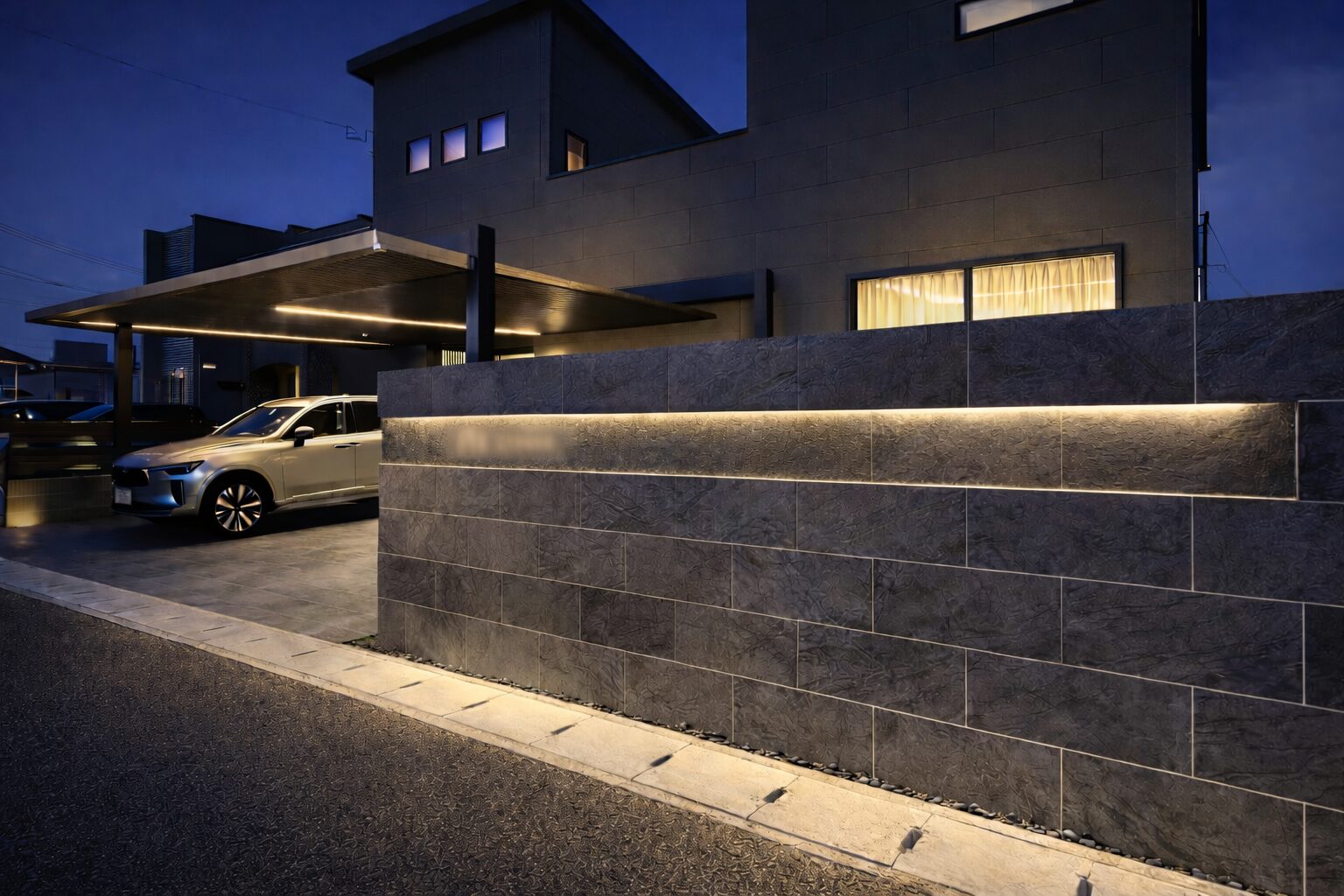 タイルで落ち着いた雰囲気を持たせながら、カーポートの存在感を引き立てることで、
