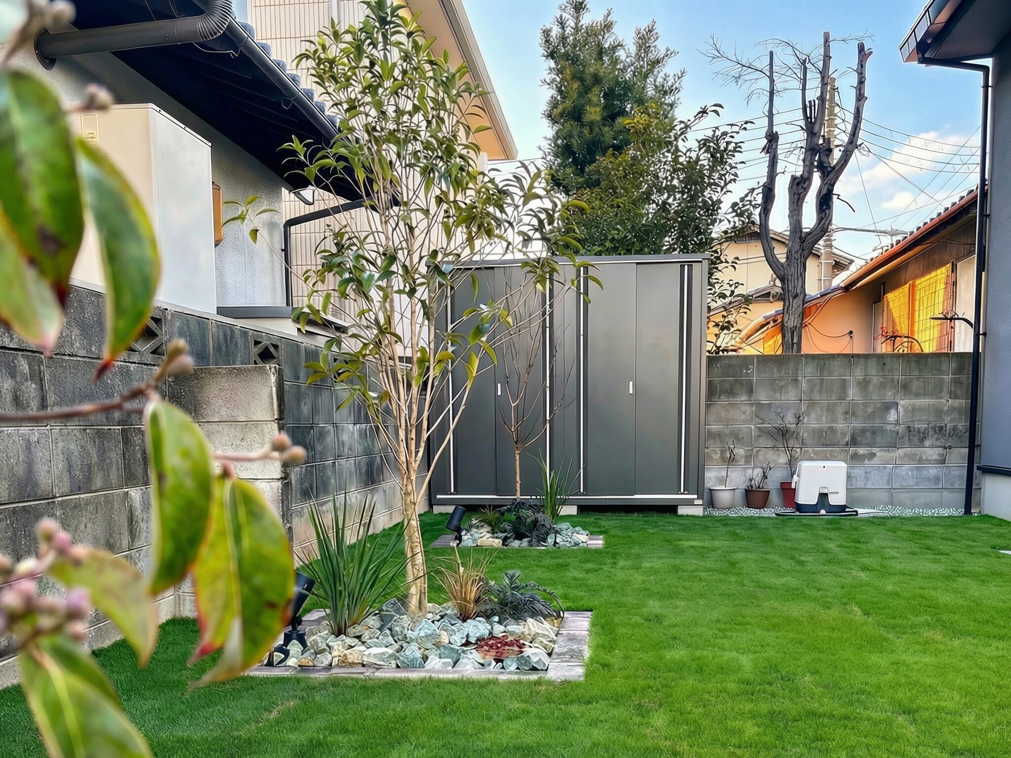 庭スペースには芝生と植栽スペース、物置を配置し、使いやすさと管理のしやすさを両立しています。