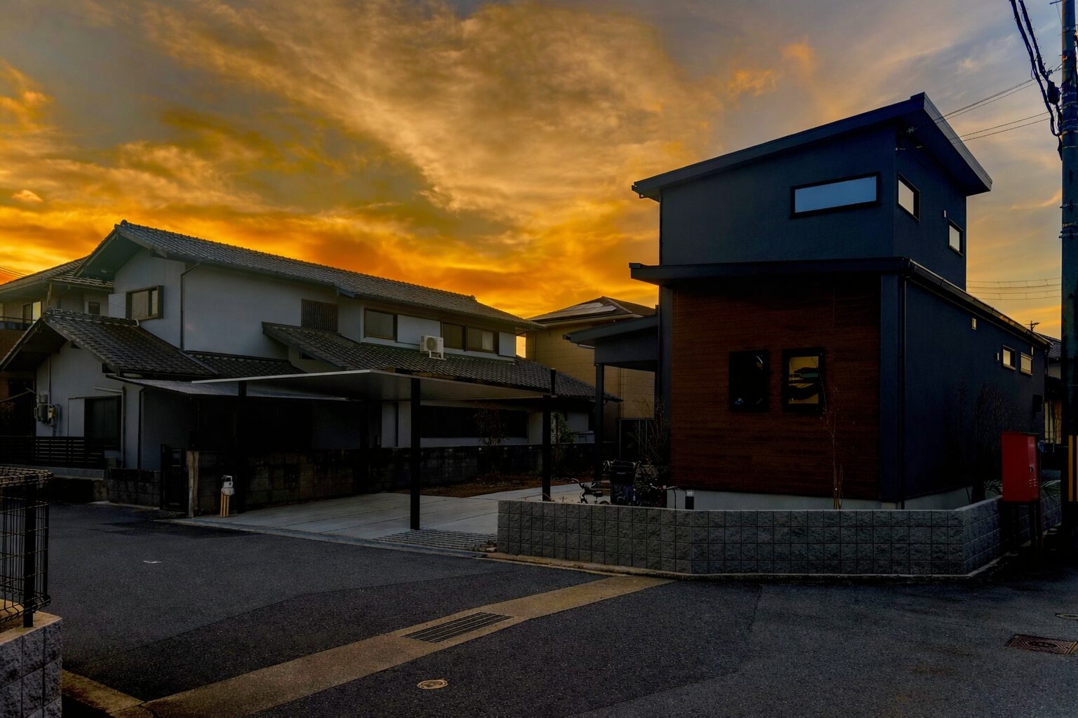フラット屋根のカーポートと広い駐車スペースを確保し、建物と一体感のあるシンプルモダンな外観に仕上げました。