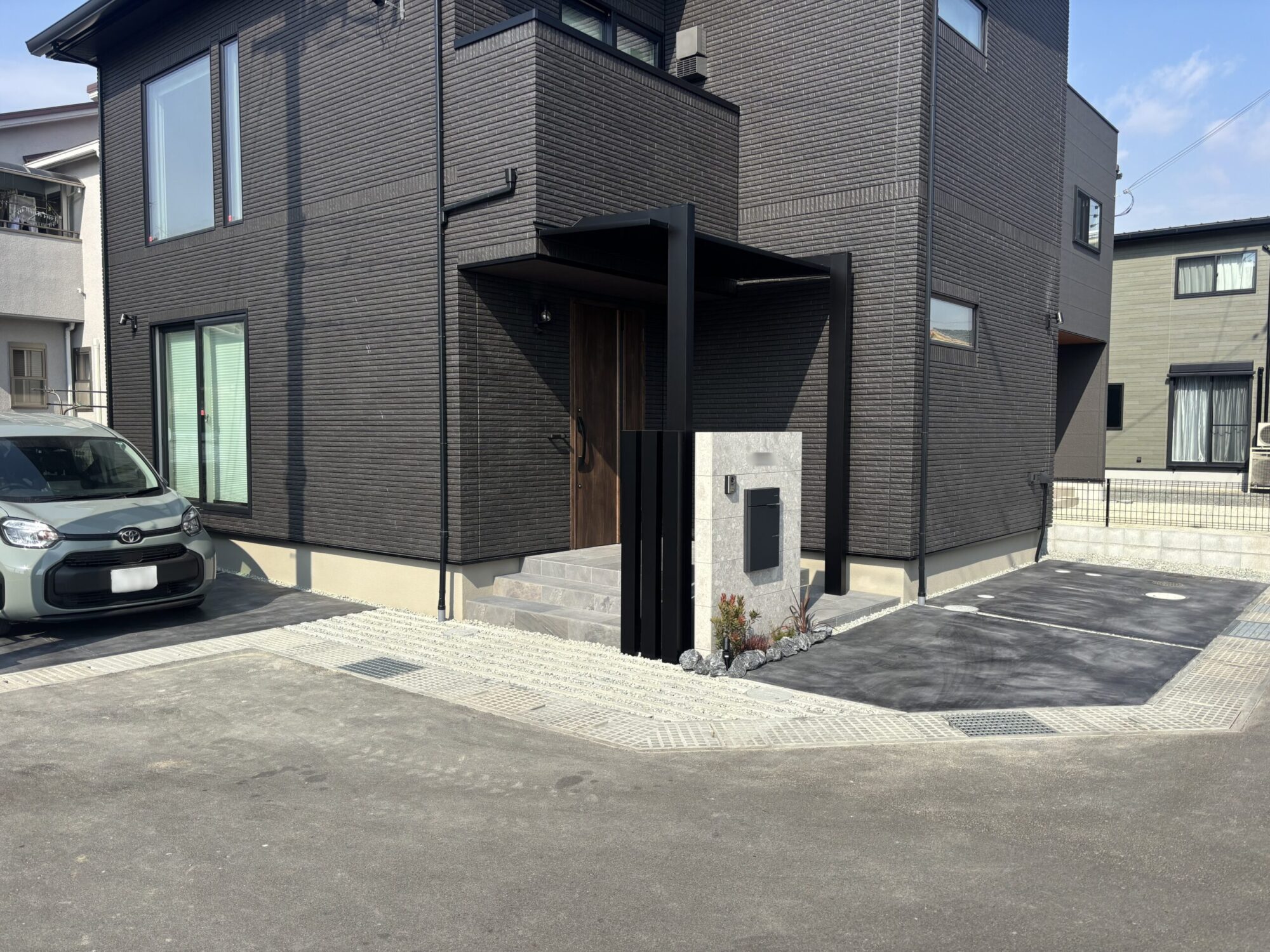 外壁の黒色に合わせ、直線を基調としたシンプルモダン外構に仕上げました。