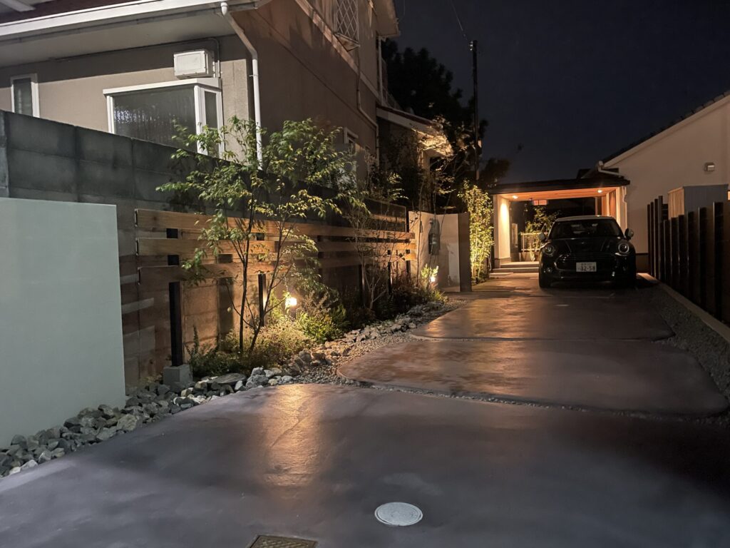 曲線を取り入れた土間コンクリートや植栽、照明を組み合わせ、使いやすさと見た目のバランスを両立したナチュラルモダン外構が完成しました。
