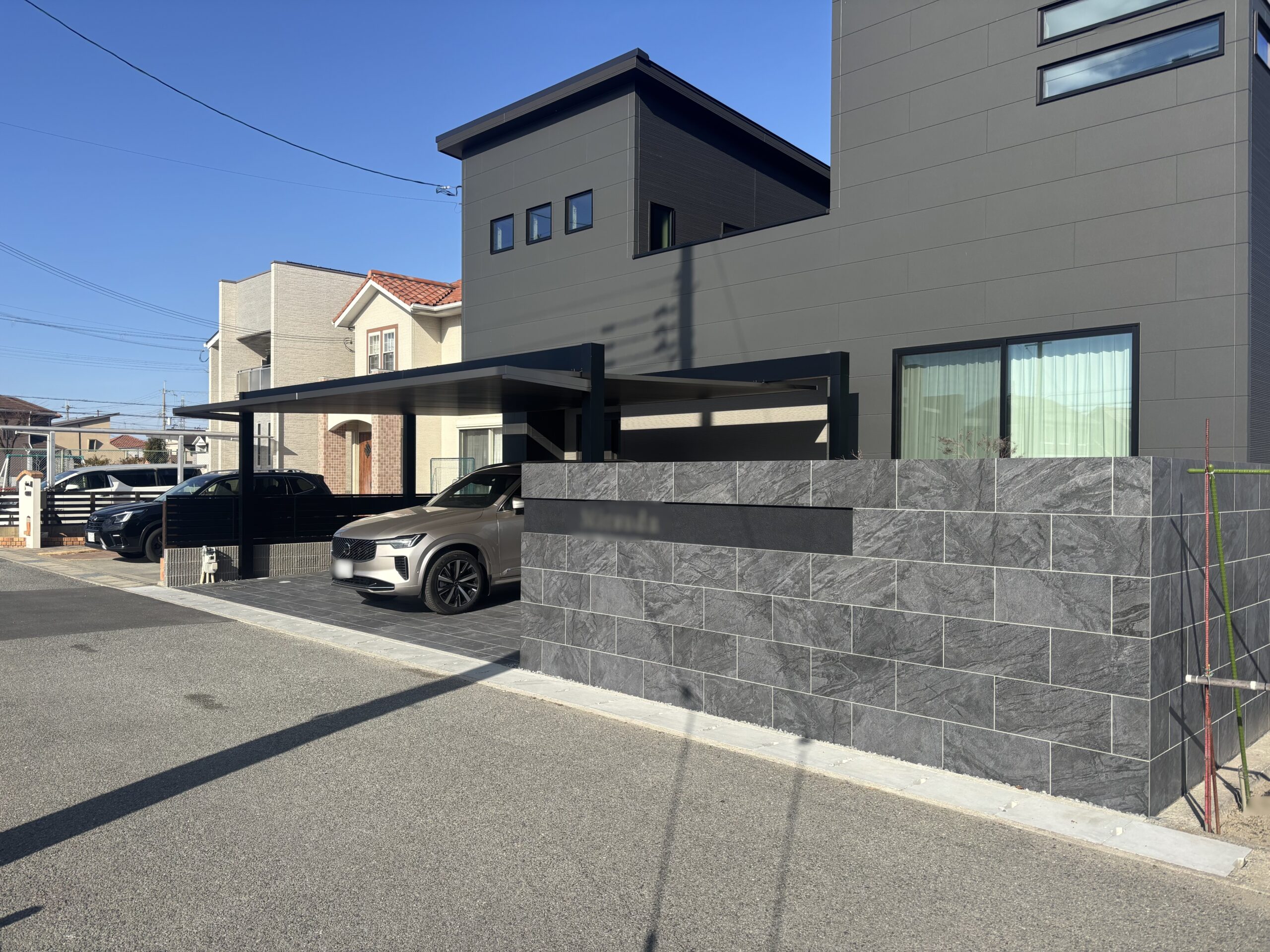 全体的にシンプルな印象の外構ですが、素材や立体感を意識することで、存在感のあるモダンな外構に仕上がりました!